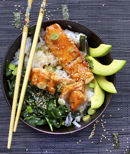 7.Assemble rice bowls: Put rice and spinach in the bottom of a bowl. Lay salmon on top. (skin will peel off easily, if you prefer it skinless) Garnish with avocado slices. Sprinkle with scallions and nori-sesame confetti. Drizzle with teriyaki sauce. Repeat for each bowl.