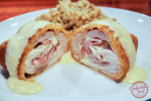 Top each cutlet with a slice of ham and cheese - then roll up tightly, tuck in the ends and secure with toothpicks.