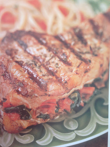 In a large saute pan over medium heat, heat olive oil and cook the onion until soft, about 5-6 minutes. Add the garlic and cook for 1 more minute. Add the tomatoes and spinach and cook for about 5 minutes. Remove from the heat and allow to cool for 3-4 minutes, then add the remaining stuffing ingredients. Divide into 4 equal portions.