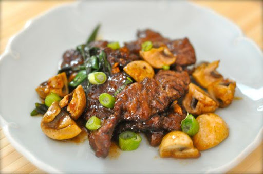In wok, heat vegetable oil and sesame oil. Saute beef until just done, and outside begins to crisp. Remove meat from pan. You may need to do this a few pieces at a time. Once all of meat has been cooked and removed from pan, add minced ginger and garlic. Saute ginger and garlic for approximately 60 seconds, remaining oil should become very fragrant. Add soy sauce, water, Maggi seasoning, brown sugar, and rice wine vinegar. Stir until the sauce thickens, return meat to pan, and add quartered button mushrooms to the pan. Cook for another 60 seconds or so and add half of chopped scallions. When serving Mongolian beef add remaining scallions to dish.