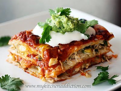 To assemble lasagna, spread 1/3 sauce mixture over bottom of casserole dish. Top with 1/2 of the tortillas, overlapping and cutting them as necessary to
