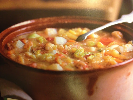 Pour in the hot water, raise the heat to medium high, bring the mixture to a boil, and add the potatoes and cabbage. Reduce the heat to medium-low, cover, and simmer until the potatoes are tender, about 20 minutes. Uncover and pour in the polenta in a thin steady stream, stirring with a wooden spoon. Stir continuously for 40 minutes while the polenta bubbles and thickens.
