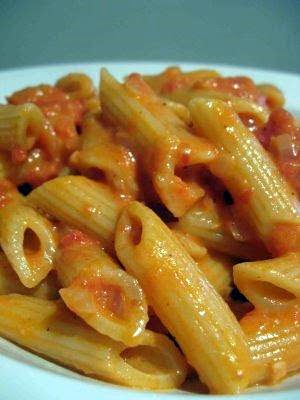 In skillet, heat oil, garlic and red pepper. Add crushed tomatoes. Bring to boil. Reduce heat to low and simmer 15 minutes. Stir in cream and vodka. Cook 2 minutes. Pour over pasta and top with cheese.
