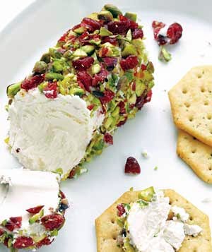 2.Roll the goat cheese in the fruit-and-nut mixture to coat. Serve with the crackers or bread.