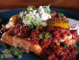 Cornbread Waffles with Ranch-Style Eggs and Cilantro Crema