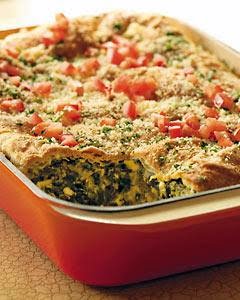 4. Brush the bottom and sides of a 9-by-13-inch baking dish with oil. Working with 1 sheet at a time, lay the dough on a lightly floured surface and roll it out slightly to fit the pan. Line the bottom of the dish with the first piece of dough, pressing into the corners. Trim off any excess with a paring knife. Spread the spinach filling evenly over the dough. Cover with the second sheet of dough, trimming around the edges of the dish. Brush the top with oil.