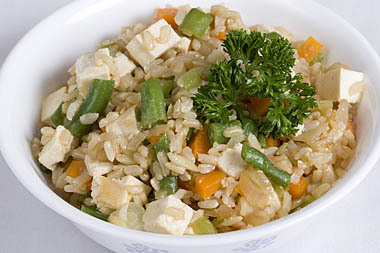 In a small bowl, combine the Tamari, vinegar, and wine. Pour over the rice and then stir to combine. Allow the rice to get slightly crusty again, then stir. Add back the tofu, add the peas and scallions, and stir gently to combine. Continue to sauté until the peas are warmed through, then serve.