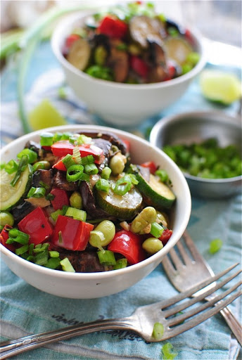 Heat the oil over medium-high in a large sauté pan. Add the mushrooms and sauté until they become tender and dark brown, about 4 minutes. Add the zucchini and bell pepper; season with salt and pepper and sauté another 3 to 4 minutes. Add the garlic and ginger; bloom for about a minute total.