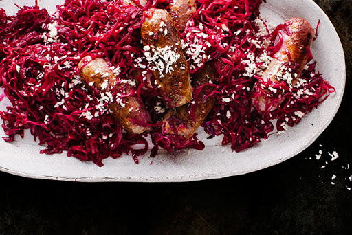 Add cabbage and beet to skillet; season with salt and pepper. Cook, stirring often, until cabbage is wilted, about 5 minutes. Add vinegar, brown sugar, allspice, and remaining beer. Cover; cook until tender, 20–25 minutes. Serve sausages with cabbage mixture, topped with horseradish.