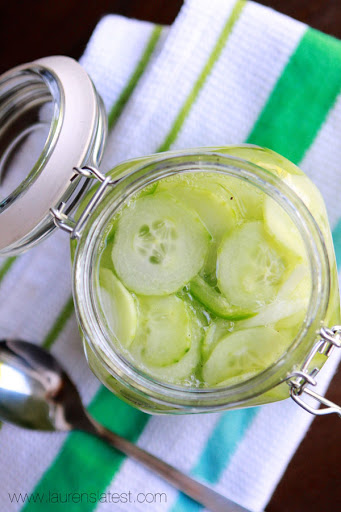 Peel cucumbers and slice very thin. Place into bowl with onion, bell pepper and garlic.