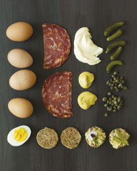 In a food processor, combine the eggs, salami, mayonnaise, mustard and whole cornichons; pulse until smooth.
