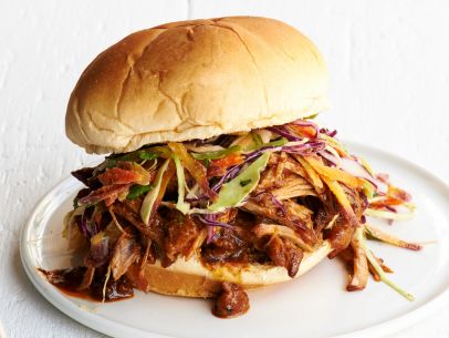 Cover the pot and transfer to the oven. Cook until the pork is very tender, about 2 hours. Uncover and continue cooking until the sauce thickens slightly, about 20 more minutes. Shred the pork with 2 forks, tossing to coat in the sauce. Serve on buns with coleslaw and pickles.