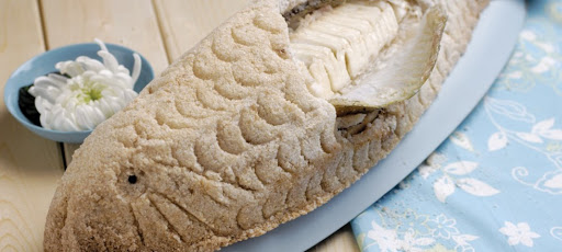 3. On a large baking sheet, pour 1/3 salt mixture in a bed the size of the fish. Place fish on top and cover with remaining salt.