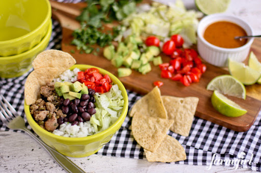 Add a couple scoops of warm cilantro lime rice to the bottom of individual serving bowls, followed by a scoop of prepared turkey taco mixture. Have the rest of your desired taco mix-ins and condiments ready for individuals to add as they please.