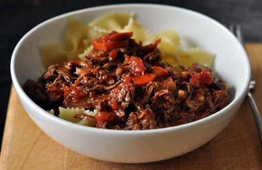 Add wine and continue to simmer until liquid has reduced by half, about 10 minutes. Crush the tomatoes in the can with a fork or back of a spoon, then add them and their juices to the pot. Bring to a simmer, then cover and place in a 275-degree oven for 3 to 4 hours. Alternately, put everything in a slow cooker and cook for 4 hours on HIGH or at least 8 hours on LOW. (I have cooked this on LOW for up to 16 hours; it's sublime when cooked that long!) The longer it cooks the more tender it will be. When ready to serve, go through with two forks and shred any remaining chunks of meat. Taste and season if necessary with additional salt and pepper.