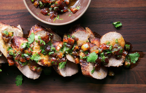Toss dates, orange juice, reserved pan drippings, 3 Tbsp. chopped cilantro, and remaining 2 Tbsp. oil in a small bowl; season with salt and pepper. Spoon relish over pork and top with cilantro leaves.