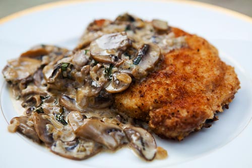 1 Sauté onions, garlic, and mushrooms in 2 Tbsp of olive oil in a large skillet on medium high heat until the mushrooms are browned - about 10-15 minutes. Add the wine, increase the heat to high, and boil down until the liquid is reduced to almost a glaze, about 4 minutes. Add the chicken stock and bourbon, boil until reduced by two thirds. Add the cream and simmer several minutes until the sauce thickens.