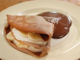 To serve: Fill the crepes with sliced banana or strawberries and sweetened cinnamon-flecked whipped cream. They look best folded over into a triangle. Drizzle chocolate sauce over top.
