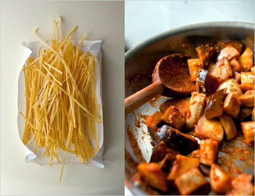 SPAGHETTI w/WHITE & BLACK EGGPLANT & TOMS