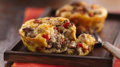 In medium bowl, stir baking mixture ingredients with whisk or fork until blended. Spoon 1 scant tablespoon baking mixture into each muffin cup. Top with about 1/4 cup burger mixture. Spoon 1 tablespoon baking mixture onto burger mixture in each muffin cup.