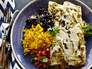 Meanwhile heat a 2 count of olive oil in a medium saucepan over medium heat. Add the onion and cook until soft and caramelized - this should take 5 to 7 minutes. Add the garlic and cumin then cook for a further minute. Sprinkle on the flour and stir to ensure the flour doesn't burn then gradually add the chicken stock to make a veloute. Continue stirring over a low simmer until the flour cooks and the liquid thickens. Turn off the heat, add half of the roasted tomatillo chile salsa, some additional fresh chopped cilantro and fold in the shredded chicken meat. Season, to taste, with salt and pepper.