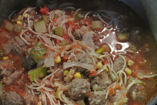 Add meatballs to soup. Cover and cook till vegetables and vermicelli are tender, about 15 minutes longer. Pass Parmesan to sprinkle atop.