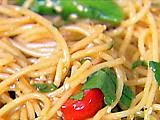 Combine the spaghetti, sugar snap peas, peppers and scallions in a large bowl. Pour the dressing over the spaghetti mixture. Add the remaining 1 tablespoon of sesame seeds and the parsley and toss together.