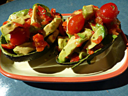 Scoop out meat from avocado halves and chop. Transfer to a bowl and add bell pepper, tomatoes, scallion, and cilantro.