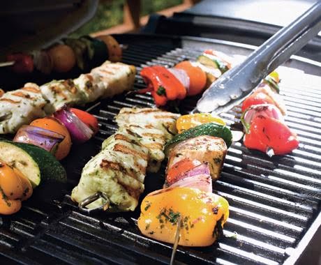 Spray grill rack with nonstick spray; prepare barbecue (medium-high heat). Divide fish cubes among remaining 4 skewers. Grill vegetable skewers until vegetables are slightly charred and tender, turning occasionally, 10 to 12 minutes. Grill fish skewers until fish is cooked through, turning occasionally, 8 to 10 minutes.