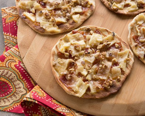 Dividing toppings equally between the 8 flatbreads, sprinkle with bacon, drizzle with honey top with cheese and sprinkle with walnuts. Broil flatbreads 2-3 minutes until cheese starts to melt. Remove from oven and sprinkle with sea salt to taste.