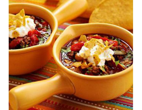 Add the taco seasoning packs, black pepper, and crushed red pepper. Stir until the meat is evenly coated. Pour in the cans of tomato sauce and the beef broth and stir until evenly combined. Bring the mixture to a boil, reduce the heat to low, and simmer for 5 minutes. Add the chopped cilantro, stir, and serve. Top each bowl of soup with a dollop of sour cream and some crushed hard taco shells.
