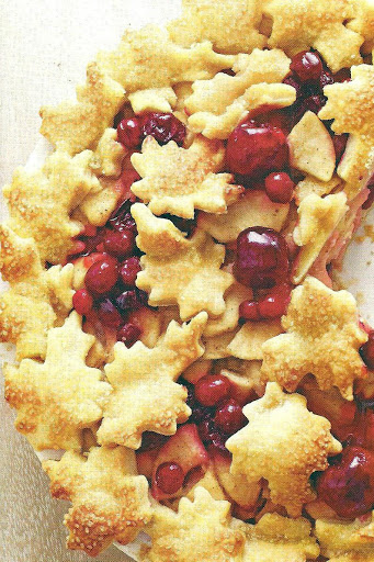 4. Using a slotted spoon, spoon 1/3 of the cranberry mixture into the bottom of the prebaked crust. Layer half the apple mixture on top of the cranberries. Spoon another third of the cranberry mixture on top of the apples in random dollops. Spoon over remaining apples. Spoon remaining cranberry mixture on top in random dollops, leaving ockets of apple visible on top. Leave the flat edge of the crust free from filling.