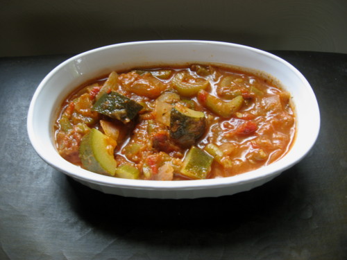 When the sauce returns to the boil, add the zucchini with the herbs. Cook gently until the zucchini is very tender, about 15 minutes. Let stand 20 minutes before serving.
