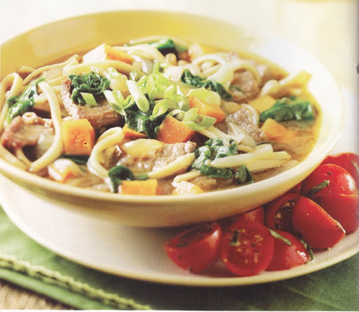 marinade, broth, and water. Add sweet potato and bring to boil. Add noodles; cook until sweet potatoes are tender and noodles are done, about 8 minutes. Stir in beef and spinach. Cook until spinach is wilted. Garnish each