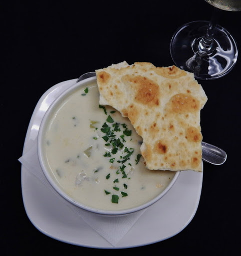 Add wine, and let simmer 3 minutes. Add stock, clam juice and cream. Simmer 20 to 25 minutes, stirring often to prevent scorching. Skim soup often.