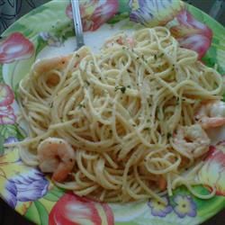 4.Drain pasta, and transfer to a serving dish. Toss with garlic butter and shrimp. Sprinkle with grated Parmesan cheese. Serve warm.