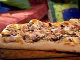 Roll dough out into a large rectangle and transfer to a large baking sheet. Top dough with mozzarella cheese, to within 1/2-inch of the edges and then sprinkle garlic flakes all over cheese. Top with chicken, mushrooms and olives. Sprinkle feta cheese over top and then sprinkle oregano over everything. Bake 10 to 12 minutes, until crust is golden brown and cheese melts. Serve with Cherry Tomato Salad.
