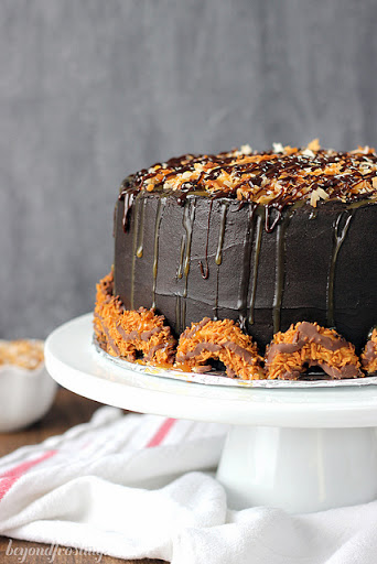 Cut Samoa cookies in half and align along the bottom of the cake.