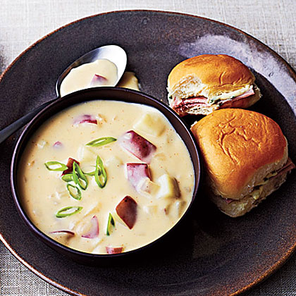1. Melt butter in a medium saucepan over medium-high heat. Add onion to pan; sauté 5 minutes or until onion is tender. Sprinkle with flour; cook 1 minute, stirring onion mixture constantly. Add potato, milk, broth, and 1/2 cup water to pan; bring to a boil. Cover, reduce heat, and simmer 10 minutes. Add 1/2 cup reduced-fat sharp cheddar cheese and ground red pepper; cook 2 minutes or until cheese melts, stirring frequently. Top each serving evenly with 1 1/2 teaspoons chopped green onions.