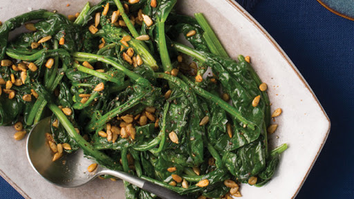 Steamed spinach gets a little kick and crunch from spiced, toasted sunflower seeds.