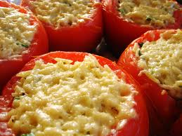 Spoon the orzo mixture into the hollowed tomatoes, filling them. Place the filled tomatoes in a casserole or baking dish with 1/2 cup of hot stock in the bottom of the dish.