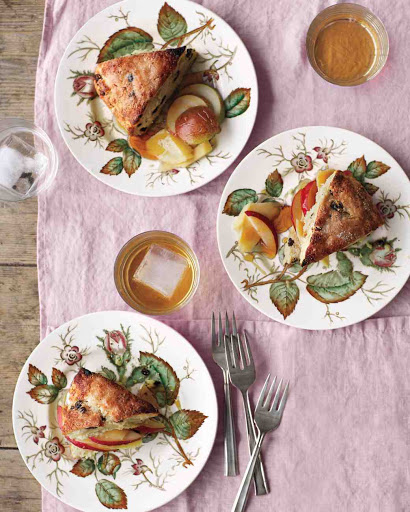Bake scones until puffed, golden brown on top, and hollow-sounding when tapped on bottoms, 15 to 18 minutes. Let cool slightly on a wire rack. To serve, split scones, sandwich pear and cheddar slices, and drizzle with honey.