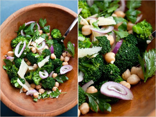 4. When the beans are tender, add the broccoli. Turn up the heat, cover and simmer or steam (depending on how much water is left in the pan) 5 minutes, until the broccoli is tender but still bright. Drain the beans and broccoli and toss with the dressing. Add the herbs and the Parmesan, toss again, and serve warm.