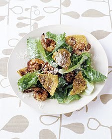 # To serve, toss lettuce with dressing. Divide among plates, and top each with shrimp and broken tortillas. Garnish with more Parmesan.