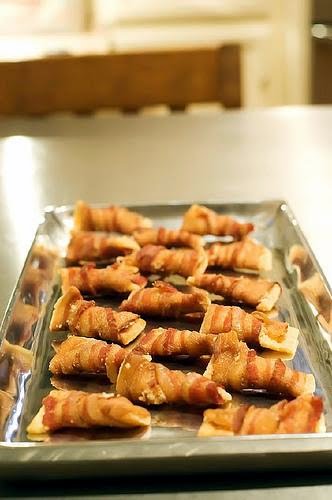 Scoop about 1 teaspoon of grated Parmesan cheese onto each cracker. Cut your package of bacon in half (or cut pieces individually) and carefully, so the cheese doesn’t fall off, wrap each cheese covered cracker in one half piece of bacon, completely covering the cracker. It should fit snugly around the cracker.