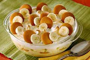 RESERVE 12 wafers for garnish. Spread small amount of custard onto bottom of 1-1/2-qt. baking dish. Cover with layers of 1/3 each of the remaining wafers, bananas and remaining custard. Repeat layers 2 times.