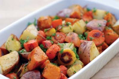 Preheat oven to 425 degrees Fahrenheit. Cut all the veggies into similarly sized pieces. Place all the cut vegetables in a single layer on a baking sheet. Drizzle with olive oil and toss well so all pieces are lightly coated. Add salt, pepper and herbs to taste. Roast for 25 to 35 minutes until all the vegetables are tender, turning once. Garnish with fresh herbs.