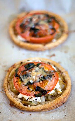 Place 1/4 of the onion mixture on each circle, again staying within the scored edge. Crumble 1 ounce of goat cheese on top of the onions. Place a slice of tomato in the center of each tart. Brush the tomato lightly with olive oil and sprinkle with basil, salt, and pepper. Finally, scatter 4 or 5 shards of Parmesan on each tart.