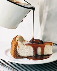 5.Unwrap the cheesecake and discard the foil. Remove the ring and transfer the cake to a plate. Arrange the 12 reserved pecans on top. Using a warm, slightly moistened knife, cut the cake into wedges, wiping and rewetting the blade between slices. Transfer the slices to plates and pour some of the Caramel Sauce on top. Serve with the remaining Caramel Sauce.
