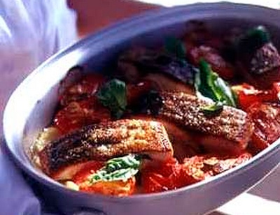 Preheat the oven to 200ºC (180ºC fan) mark 6. Put the potatoes in a pan of cold, salted water, bring to the boil and cook for 4min until just tender, then drain. Brush a 2.4 litre capacity ovenproof dish with 3tbsp olive oil, add the potatoes and garlic and top with the tomato halves. Drizzle with the remaining olive oil, season with salt and freshly ground black pepper and cook for 40min. Meanwhile, slash the salmon skin three times and season with salt and freshly ground black pepper. Heat a non- stick frying pan and sear the salmon in batches, skin-side down, for 2min. Remove the dish from the oven and put the salmon fillets on top of the potatoes. Scatter with the olives, pour over the wine and the lemon juice, then return to the oven for 15min or until the fish is cooked through. Garnish with the basil leaves to serve.